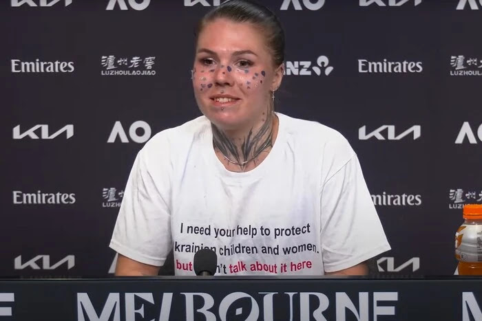 Українська тенісистка Олександра Олійникова, яка сьогодні нав’язала гідну боротьбу діючій чемпіонці Australian Open американській спортсменці Медісон Кіз, вразила австралійських журналістів не тільки яскравим зовнішнім виглядом. Олександра з’явилась на прес-конференції у футболці із закликом підтримувати Україну. Вчинок Олійникової є сміливим особливо в контексті заборон для тенісисток відкрито говорити про війну.